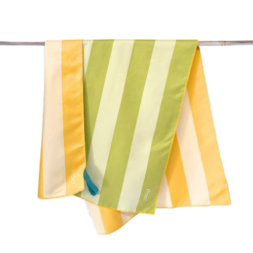 Toalla de microfibra reciclada, con doble diseño y elástico para enrollar. Es liviana, compacta, de secado rápido, súper absorbente y repele la arena. Además, es de textura suave y sin fricción.