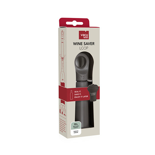 La Bomba de Vacío Loop de VacuVin crea un sello de vacío para su vino. Mantiene el sabor del vino fresco por más tiempo. Fácil de usar, fabricado de manera sustentable con 98% plástico reciclado post-consumo y diseñado para durar. ¡Séllelo, guárdelo, disfrútelo más tarde!