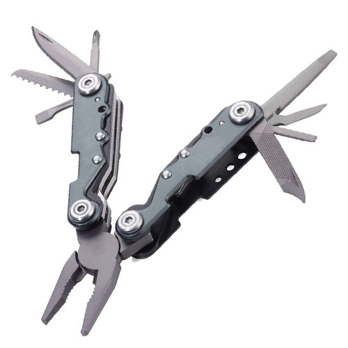 Llavero de herramientas con 10 funciones, resorte integrado, anilla de alambre para llaves, tenazas, cuchillo, sierra, abrebotellas, destornillador de punta plana (3 tamaños), destornillador Phillips, lima para madera y metal, alicates de corte diagonal, punzón (lezna), acero inoxidable 420/aluminio.