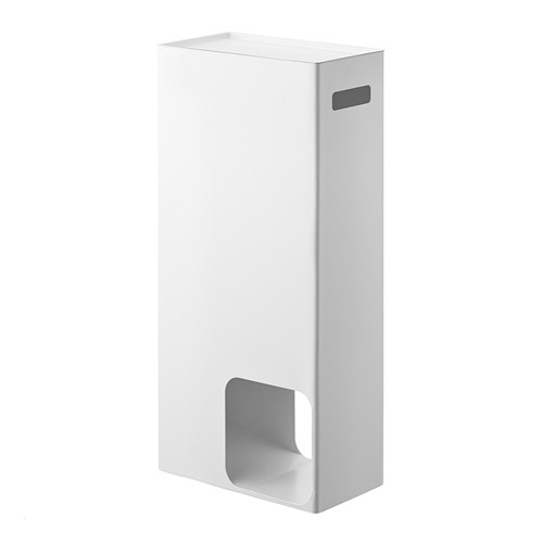 "Discreto almacenamiento de papel higiénico con diseño deslizante. Este portarrollos de papel higiénico almacena discretamente hasta 8 rollos. Su diseño inclinado asegura que el siguiente rollo se deslice automáticamente al retirar uno. La tapa desmontable facilita la recarga y también funciona como una repisa.