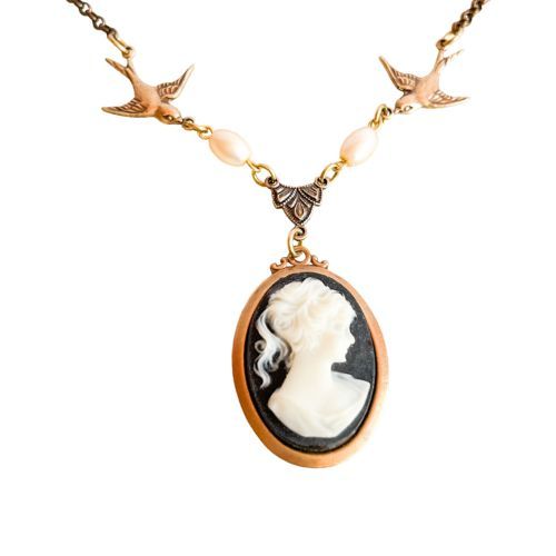 hecho de metal envejecido, camafeo de resina con relieve, perlas de fantasía y 2 hermosos conectores de golondrinas que no sostienen con gracia y creatividad.