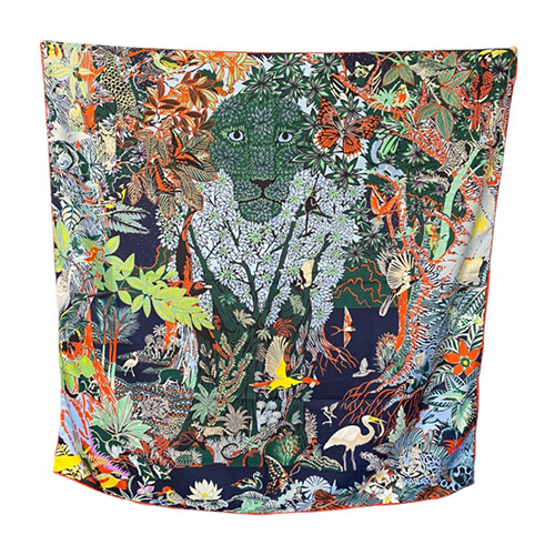 En tonos anaranjados, verdes, negro y más, con ribete naranjo cosido a mano, lo que le da una delicada terminación. En este diseño, bellos animales son protagonistas.Medidas: 90x90cmMaterial: Seda de Sarga