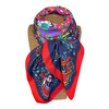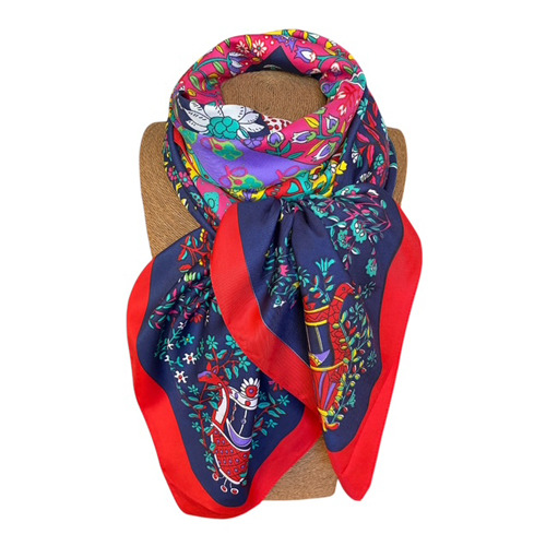 "Pañuelo alegre y combinable, donde en torno a un ribete en rojo, encuentras uno más ancho en azul marino y luego destacan bellas flores de diversos colores, tipo mandala. Ideal para jeans, pantalones azules, rojo y mucho más!Materialidad: Sarga, muy suave Medidas:1.30x1.30cm. Lavar a mano con agua fría y planchar por el revés.