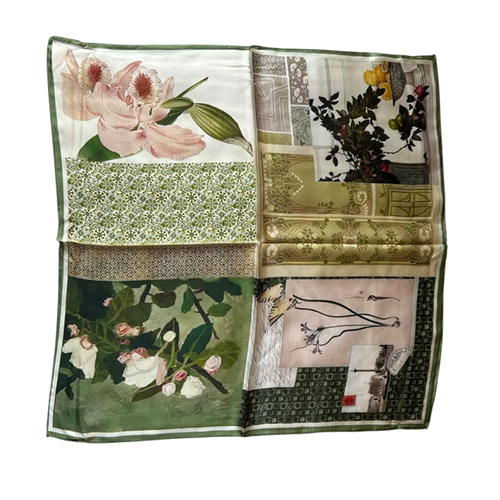 Pañuelo de seda natural, de increíble suavidad, en tonos de verde, tostado, palo de rosa y beige, donde 4 imágenes estilo clásico, componen el diseño. Medidas: 70x70cm. Materialidad: 100% seda